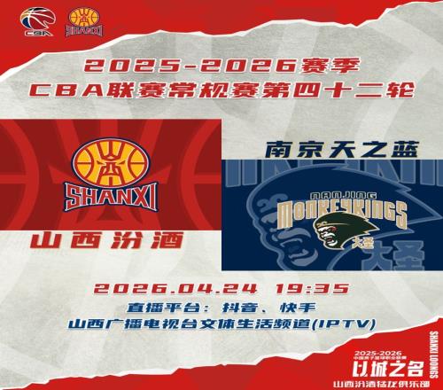 北京时间2026年4月24日19:35,2025-2026赛季CBA联赛常规赛第42轮继续进行,山西汾酒主场对阵南京天之蓝,迎来常规赛收官之战,球迷观众可以通过抖音、快手、山西广播电视台文体生活频道(IPTV)观看比赛实况,让我们与球队一起战斗到底!