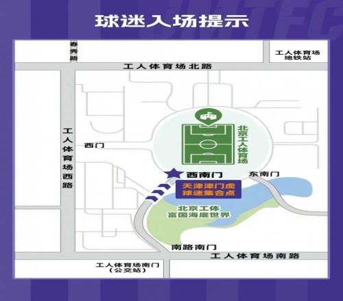 集合地点:凡持有客队区球票的天津球迷均从北京工人体育场西南门入场,其他门不可入场。